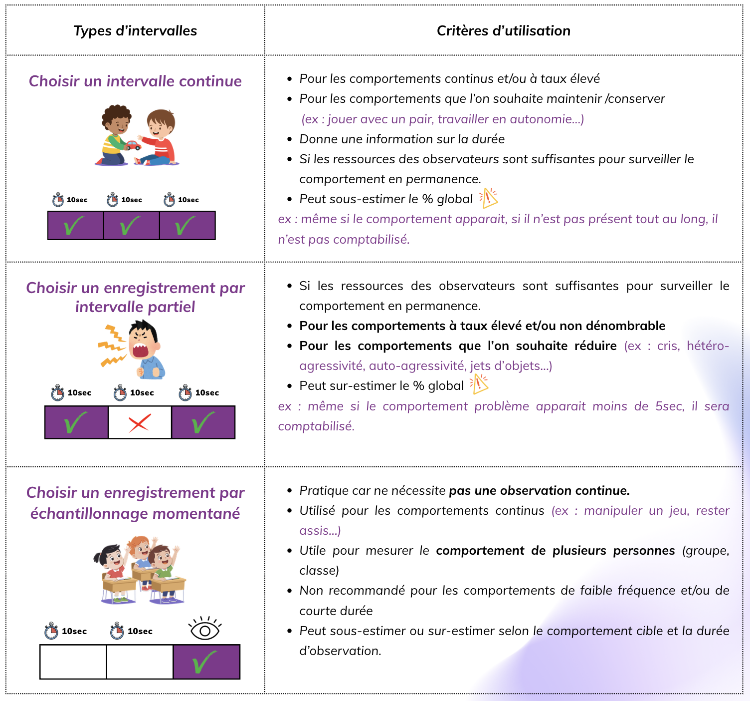 - Intervalles partiels : Le comportement cible s’est produit à n’importe quel moment pendant l’intervalle.